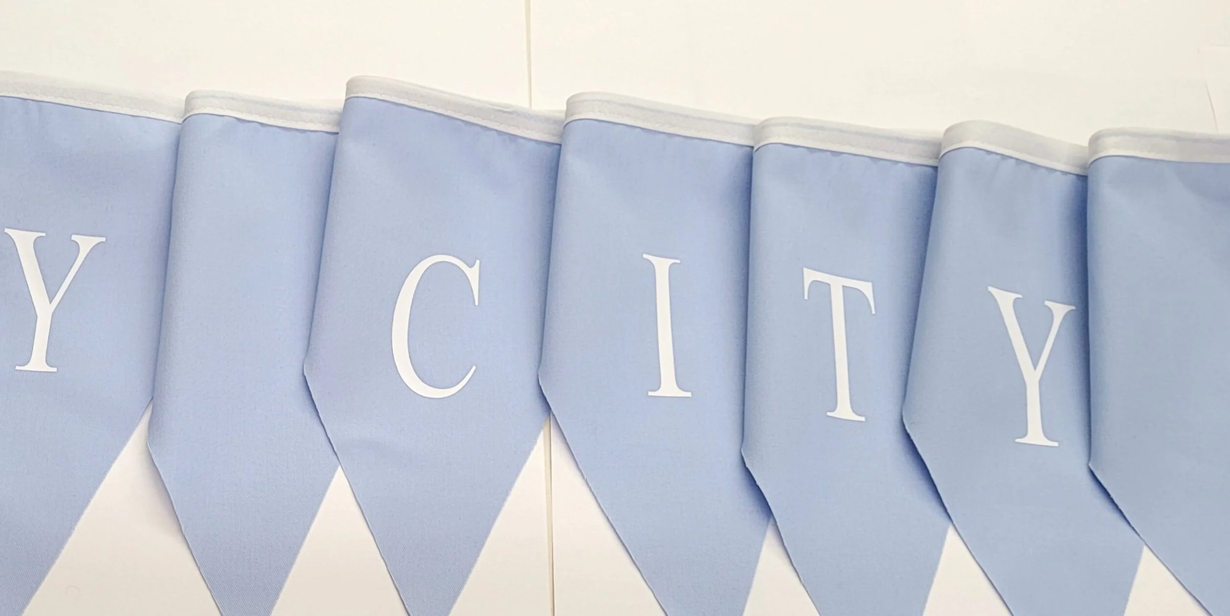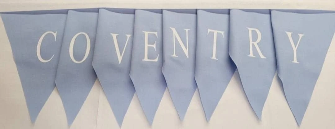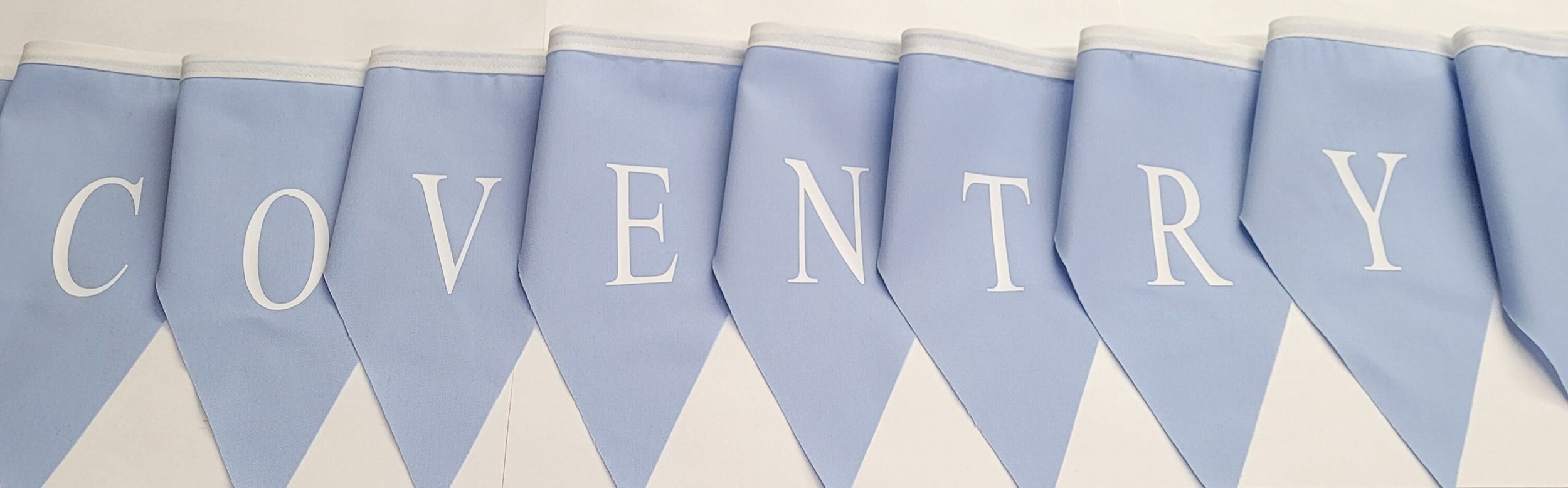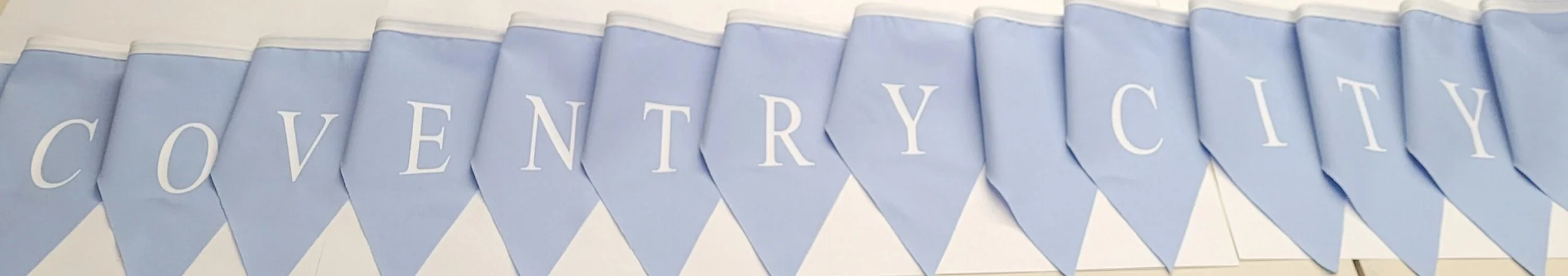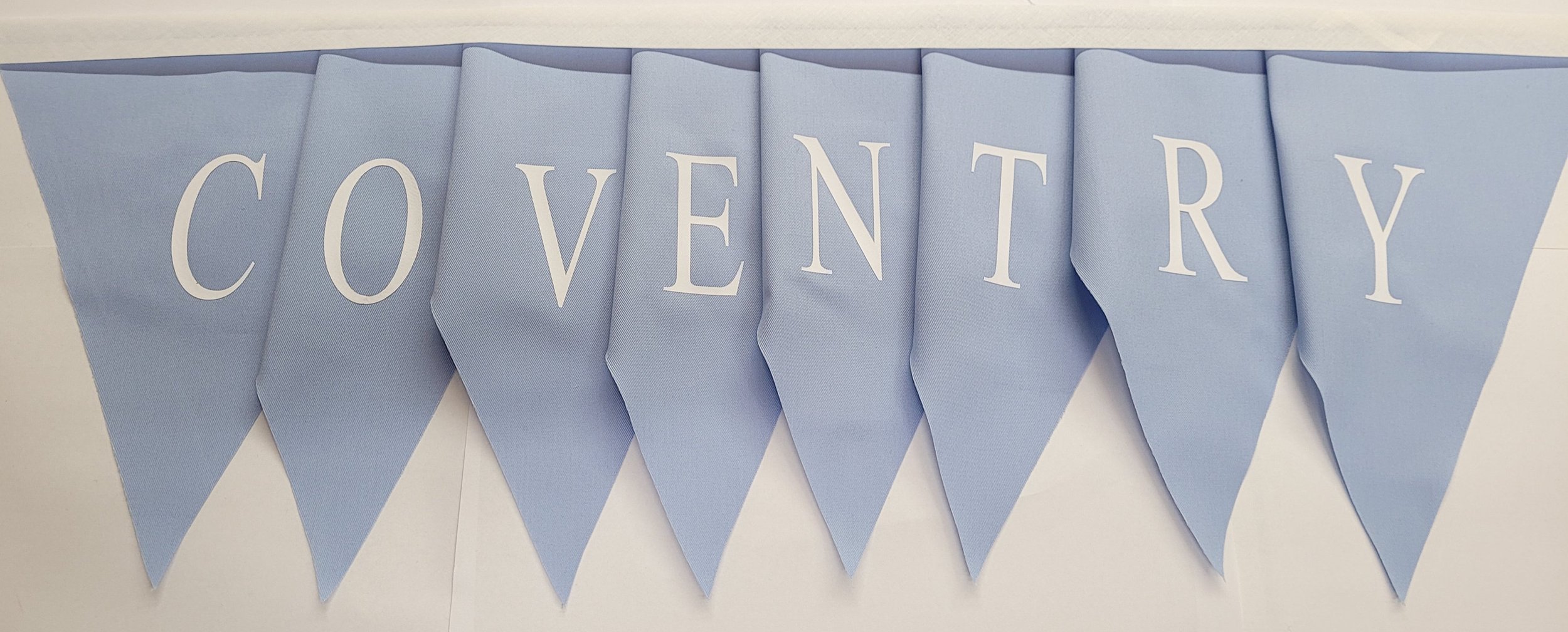 Shop › Coventry city printed bunting , sky blue flags with white vinyl print. Made in England Image 1 of 7 Image 2 of 7 Image 3 of 7 Image 4 of 7 Image 5 of 7 Image 6 of 7 Image 7 of 7 Coventry city printed bunting , sky blue flags with white vinyl print. Made in England £12.99 coventry city printed buntingpale blue flags with white vinyl printApprox 5 mtrs All made in England Add To Cart Added! coventry city printed buntingpale blue flags with white vinyl printApprox 5 mtrs All made in England