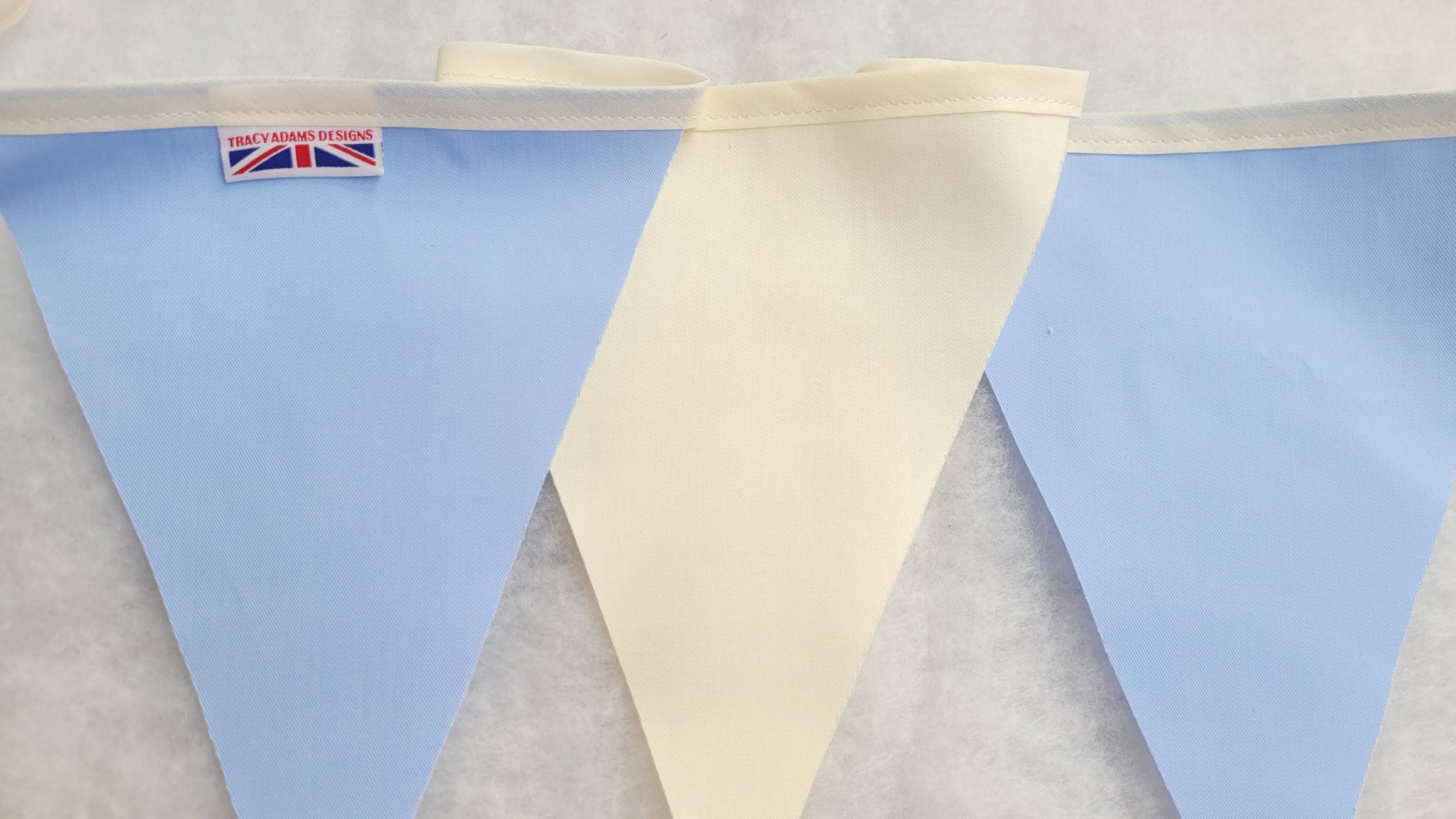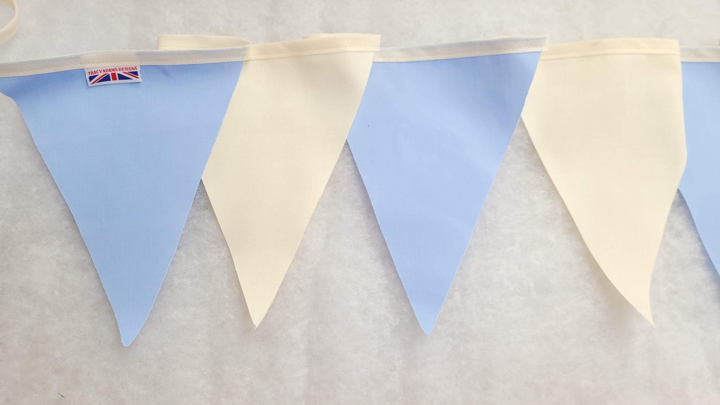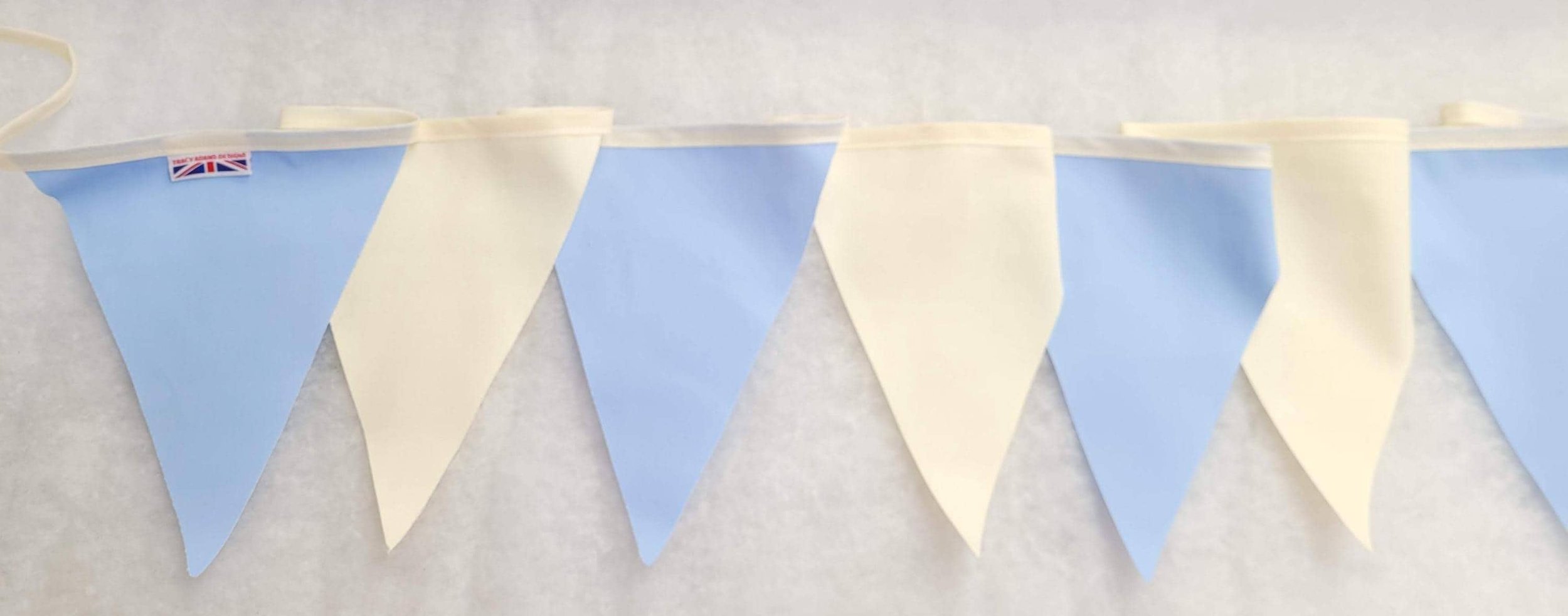 Shop › Pale Blue and Cream fabric bunting - 10 mtr. Made in England Image 1 of 3 Image 2 of 3 Image 3 of 3 Pale Blue and Cream fabric bunting - 10 mtr. Made in England £11.99 Pale Blue and Cream bunting Cream hanger across the topEach bunting is 10 mtrs 10 metre has 30 flags Poly cotton single sided flags with cotton hangeflags are the same colour on reverse of the flag as the frontFlags approx 20cm in length and 22cm width at the topAll made in England to fantastic qualityOther colours and lengths available please don't hesitate to message me Add To Cart Added! Pale Blue and Cream bunting Cream hanger across the topEach bunting is 10 mtrs 10 metre has 30 flags Poly cotton single sided flags with cotton hangeflags are the same colour on reverse of the flag as the frontFlags approx 20cm in length and 22cm width at the topAll made in England to fantastic qualityOther colours and lengths available please don't hesitate to message me