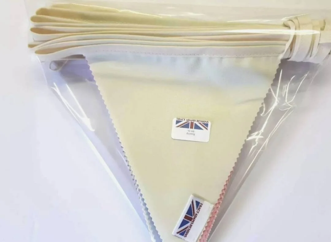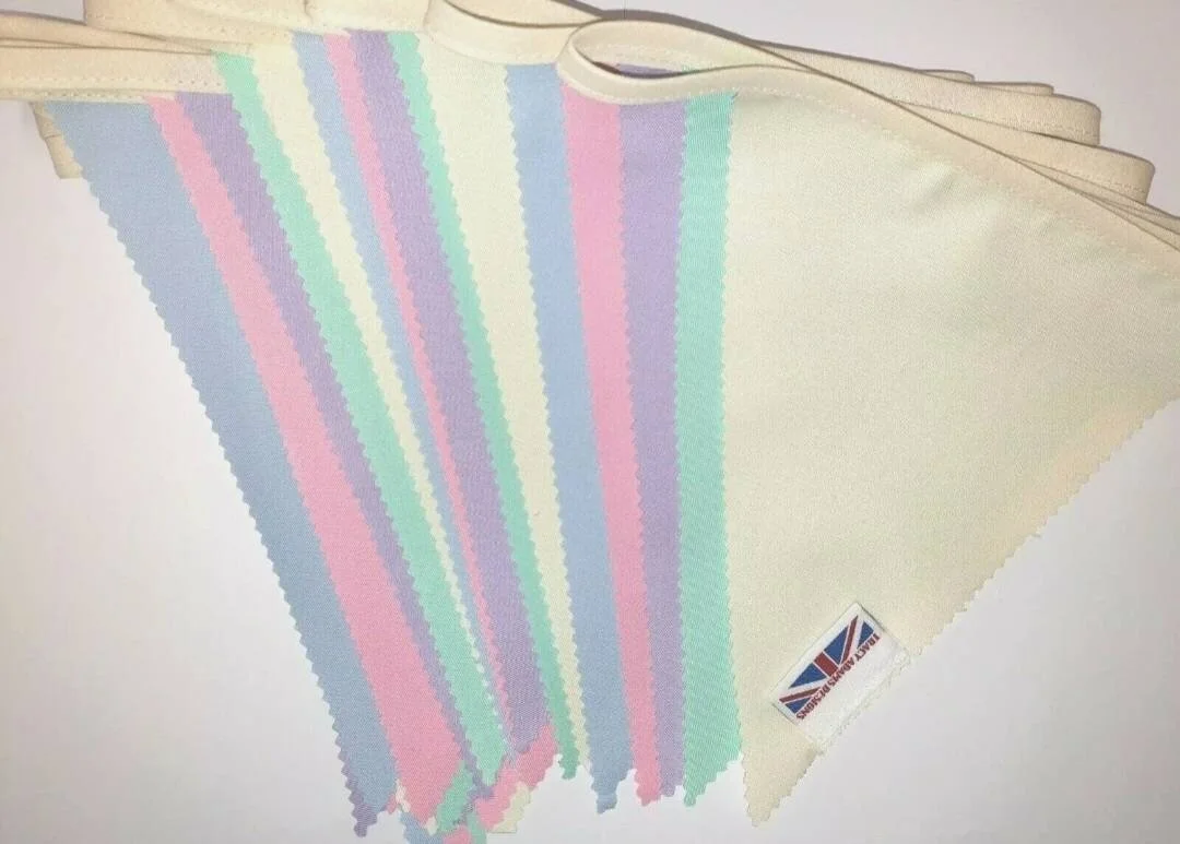 Shop › Pastel fabric bunting - 10 mtr / 30 flags. Made in England Image 1 of 2 Image 2 of 2 Pastel fabric bunting - 10 mtr / 30 flags. Made in England £11.99 Pastel fabric bunting Cream hanger across the topEach bunting is 10 mtrs 10 metre has 30 flags Poly cotton single sided flags with cotton hangerflags are the same colour on reverse of the flag as the frontFlags approx 20cm in length and 22cm width at the topAll made in England to fantastic qualityOther colours and lengths available please don't hesitate to message me Add To Cart Added! Pastel fabric bunting Cream hanger across the topEach bunting is 10 mtrs 10 metre has 30 flags Poly cotton single sided flags with cotton hangerflags are the same colour on reverse of the flag as the frontFlags approx 20cm in length and 22cm width at the topAll made in England to fantastic qualityOther colours and lengths available please don't hesitate to message me