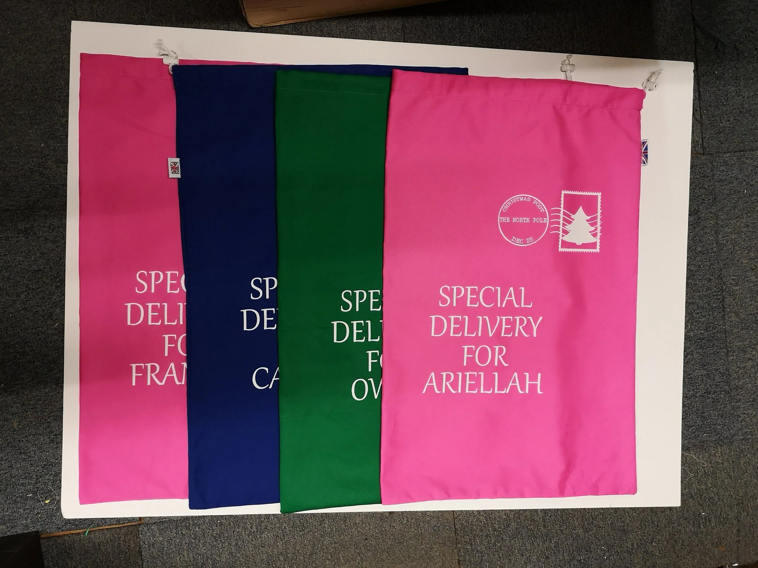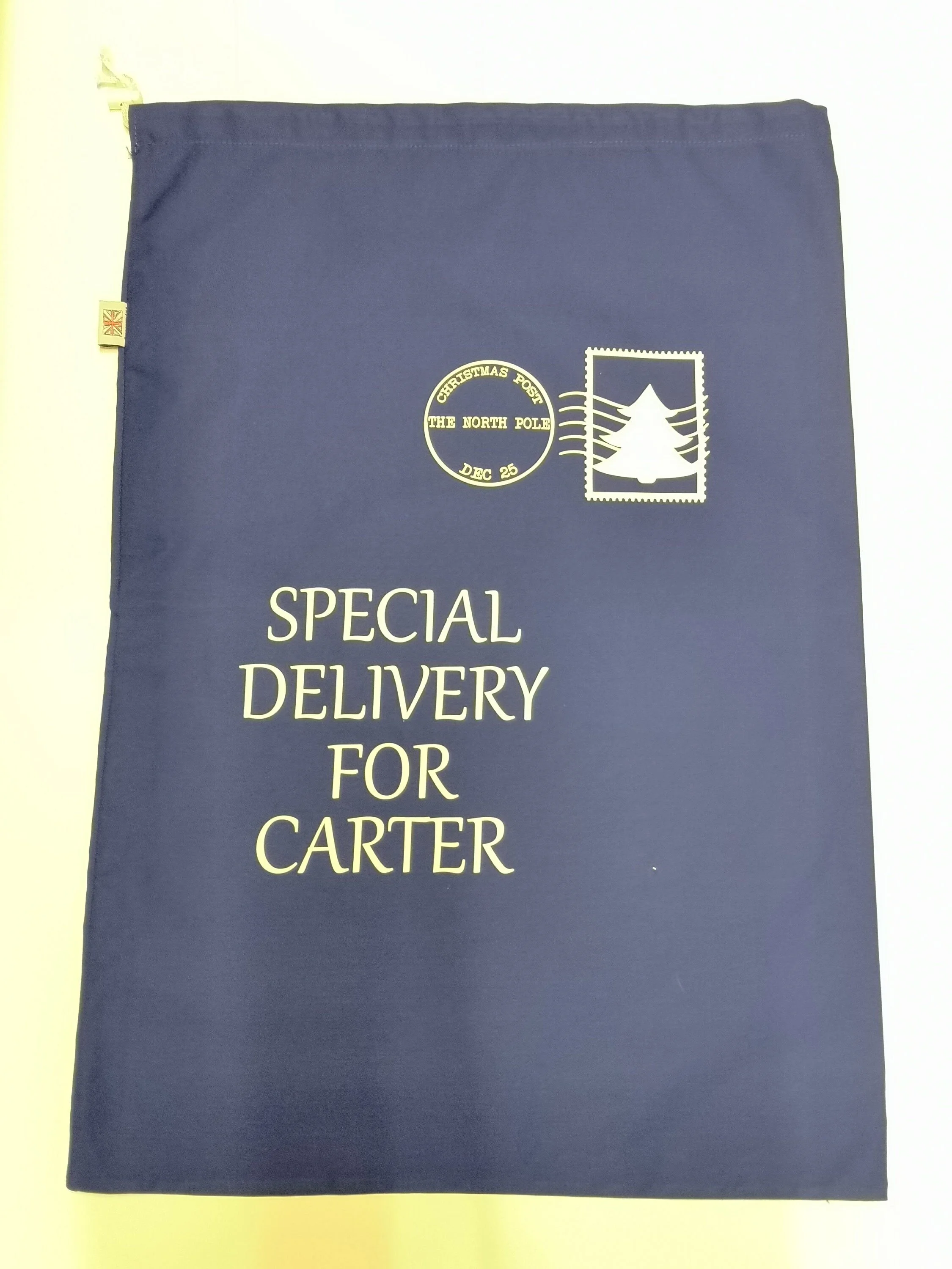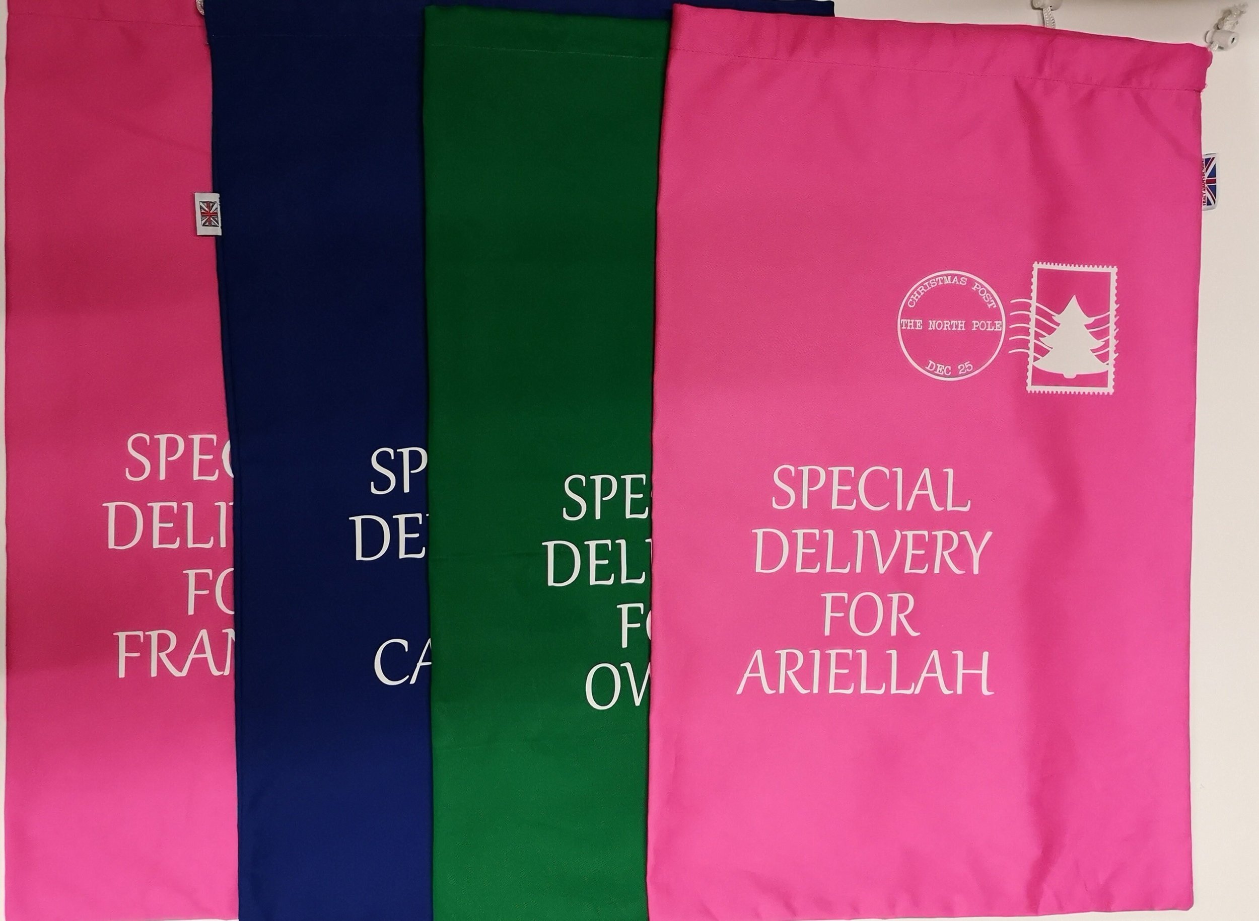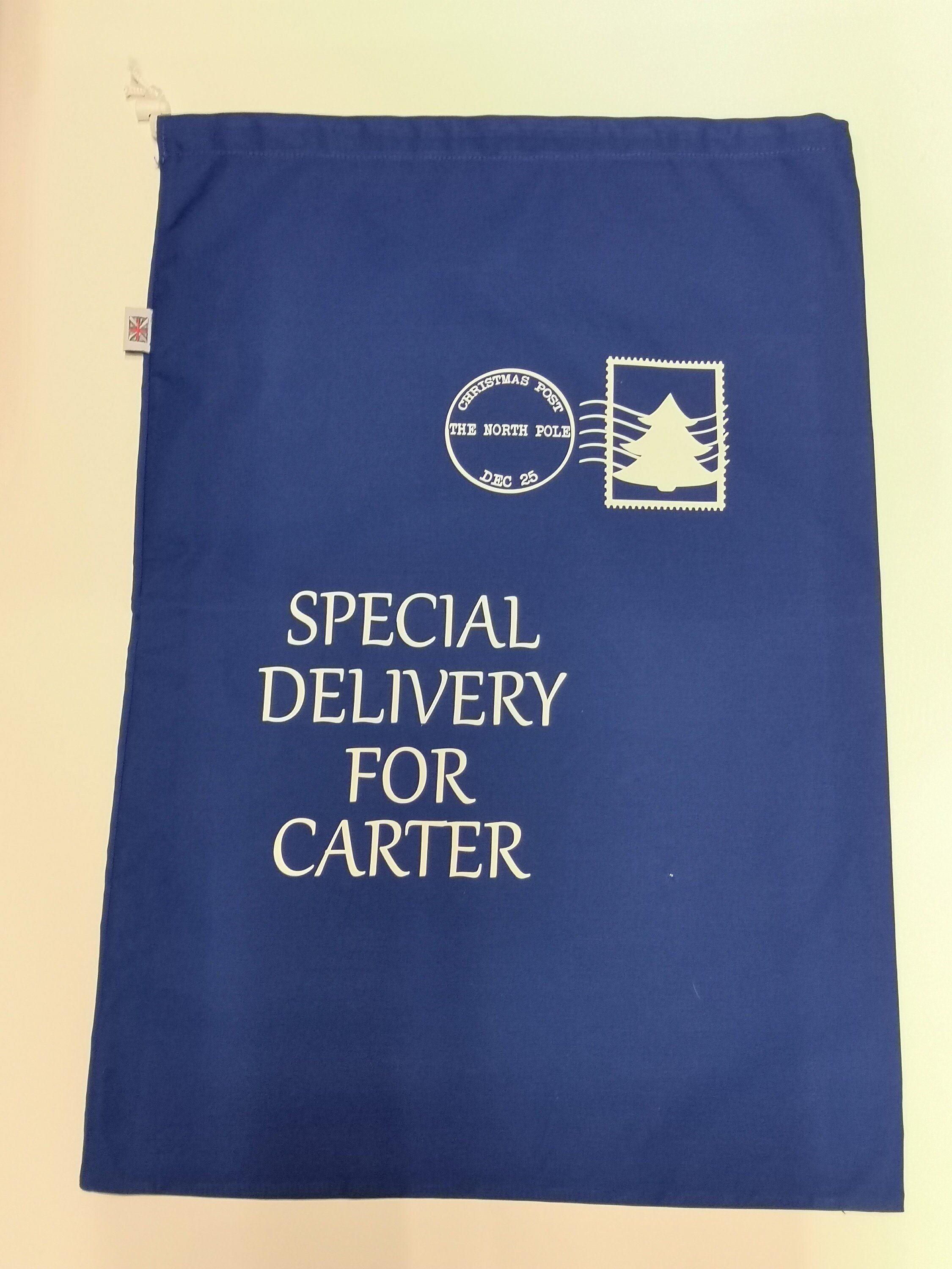 Shop › Personalised fabric santa sack - add any name. Special delivery. made in England Image 1 of 10 Image 2 of 10 Image 3 of 10 Image 4 of 10 Image 5 of 10 Image 6 of 10 Image 7 of 10 Image 8 of 10 Image 9 of 10 Image 10 of 10 Personalised fabric santa sack - add any name. Special delivery. made in England £11.99 Printed special delivery Christmas sack Sack is made from 100% cotton fabric with a white cord and a cord lock toggleso will last for a long time and a lot stronger than felt sacksoption to print and personalise the sack with any nameSize approx : 28" x 19" / 71cm x 48cmMade in England Sack colour: Red Green Black Royal Blue Burgundy Pink Add To Cart Added! Printed special delivery Christmas sack Sack is made from 100% cotton fabric with a white cord and a cord lock toggleso will last for a long time and a lot stronger than felt sacksoption to print and personalise the sack with any nameSize approx : 28" x 19" / 71cm x 48cmMade in England