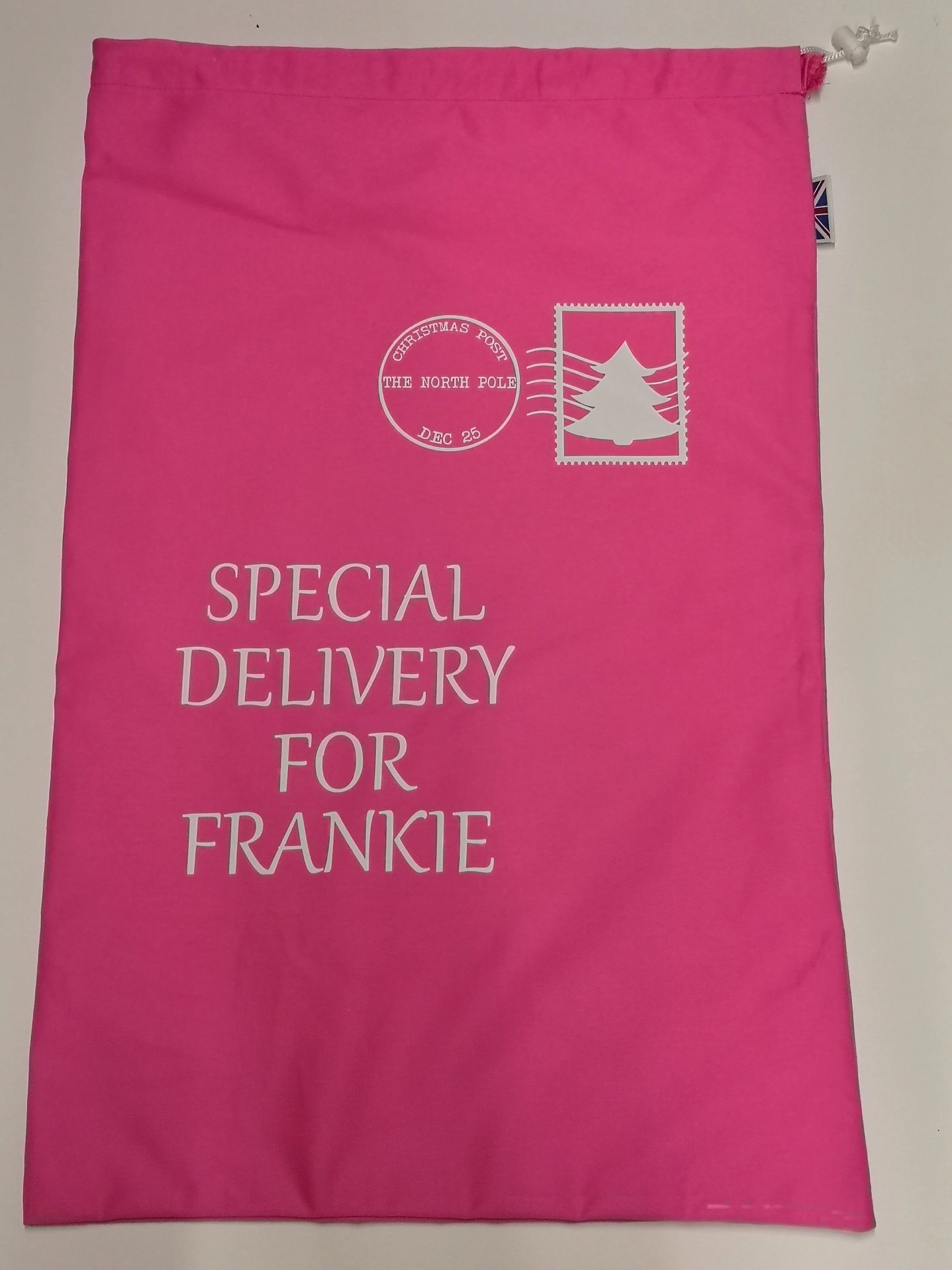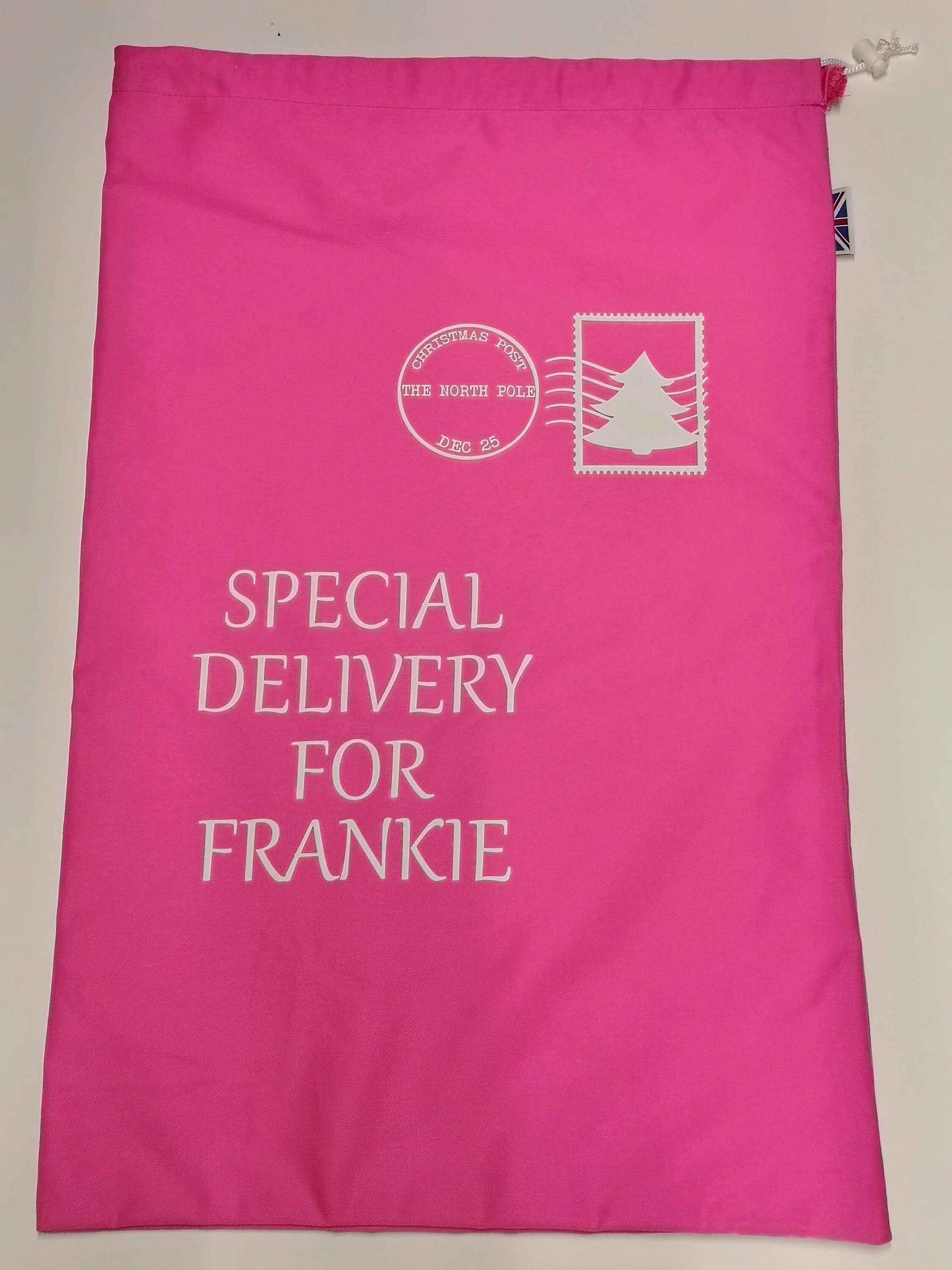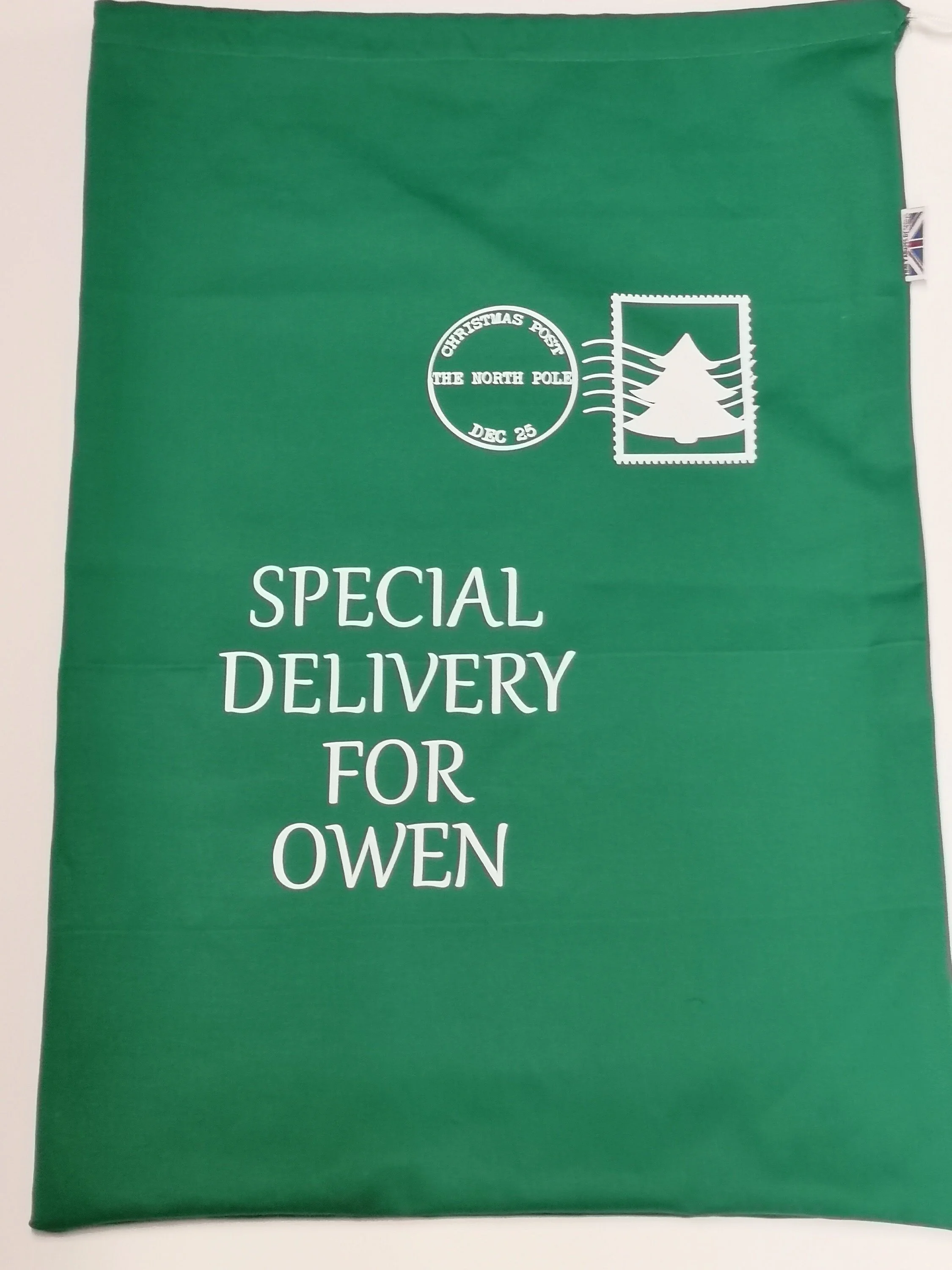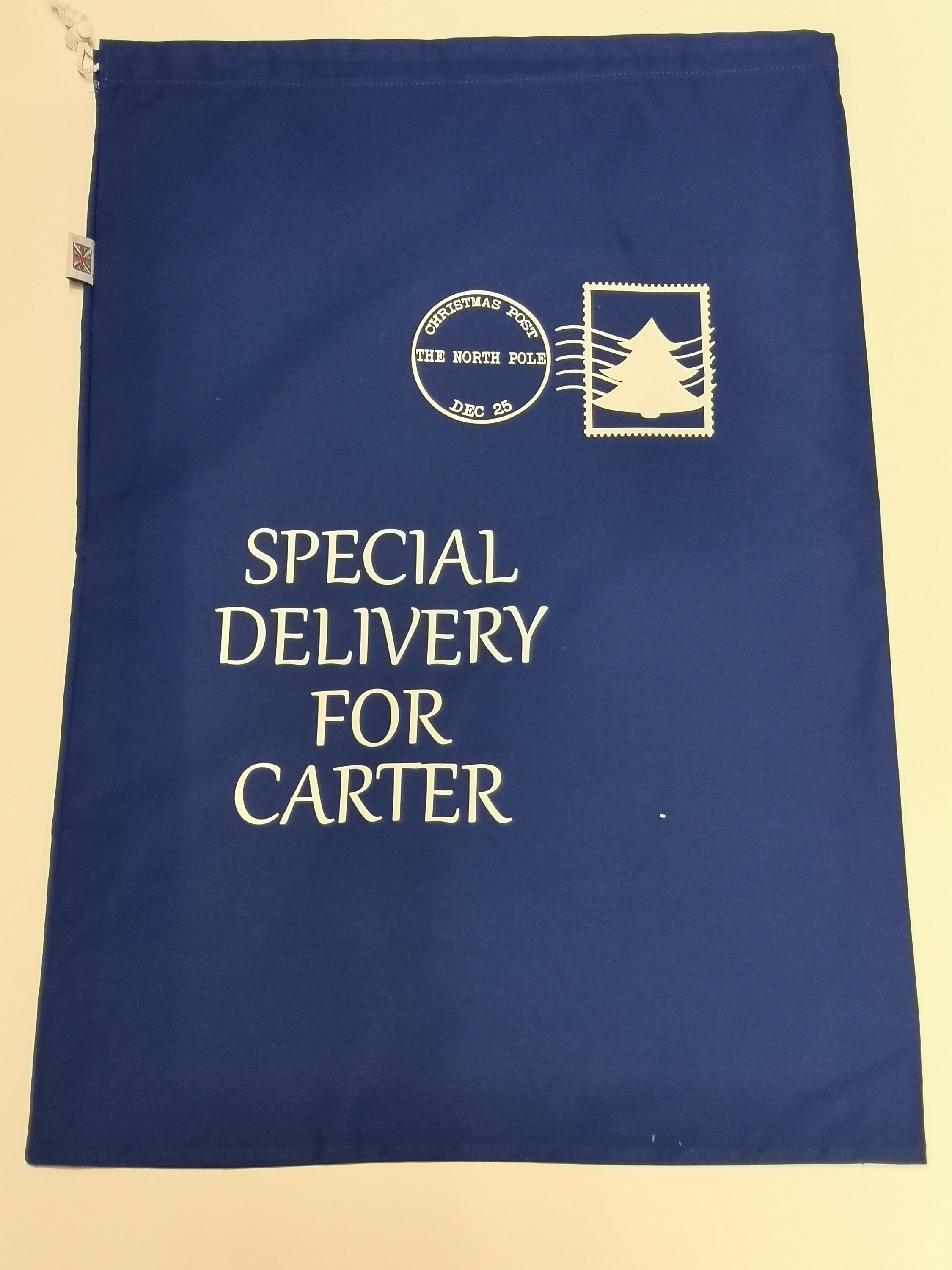 Shop › Personalised fabric santa sack - add any name. Special delivery. made in England Image 1 of 10 Image 2 of 10 Image 3 of 10 Image 4 of 10 Image 5 of 10 Image 6 of 10 Image 7 of 10 Image 8 of 10 Image 9 of 10 Image 10 of 10 Personalised fabric santa sack - add any name. Special delivery. made in England £11.99 Printed special delivery Christmas sack Sack is made from 100% cotton fabric with a white cord and a cord lock toggleso will last for a long time and a lot stronger than felt sacksoption to print and personalise the sack with any nameSize approx : 28" x 19" / 71cm x 48cmMade in England Sack colour: Red Green Black Royal Blue Burgundy Pink Add To Cart Added! Printed special delivery Christmas sack Sack is made from 100% cotton fabric with a white cord and a cord lock toggleso will last for a long time and a lot stronger than felt sacksoption to print and personalise the sack with any nameSize approx : 28" x 19" / 71cm x 48cmMade in England