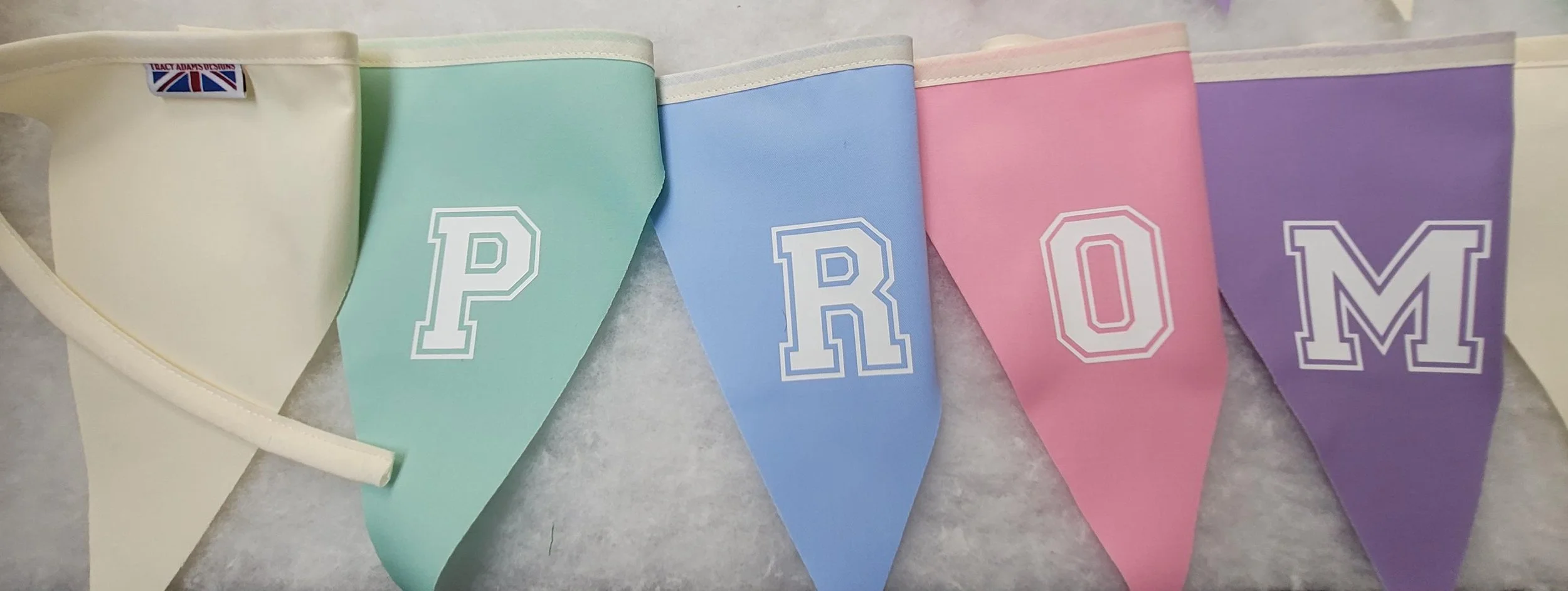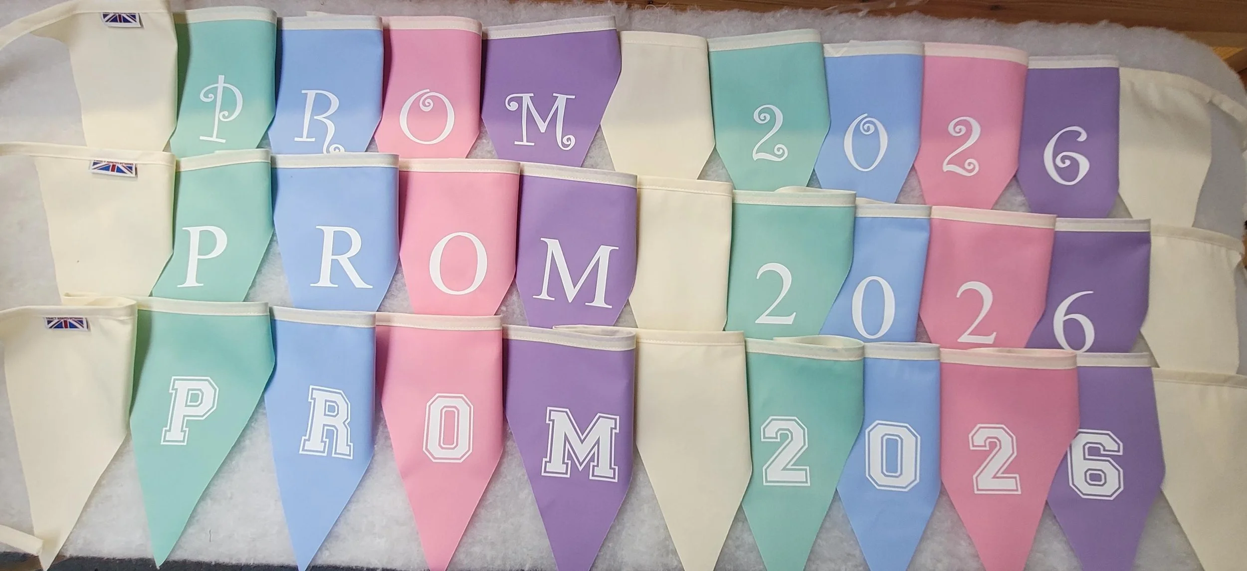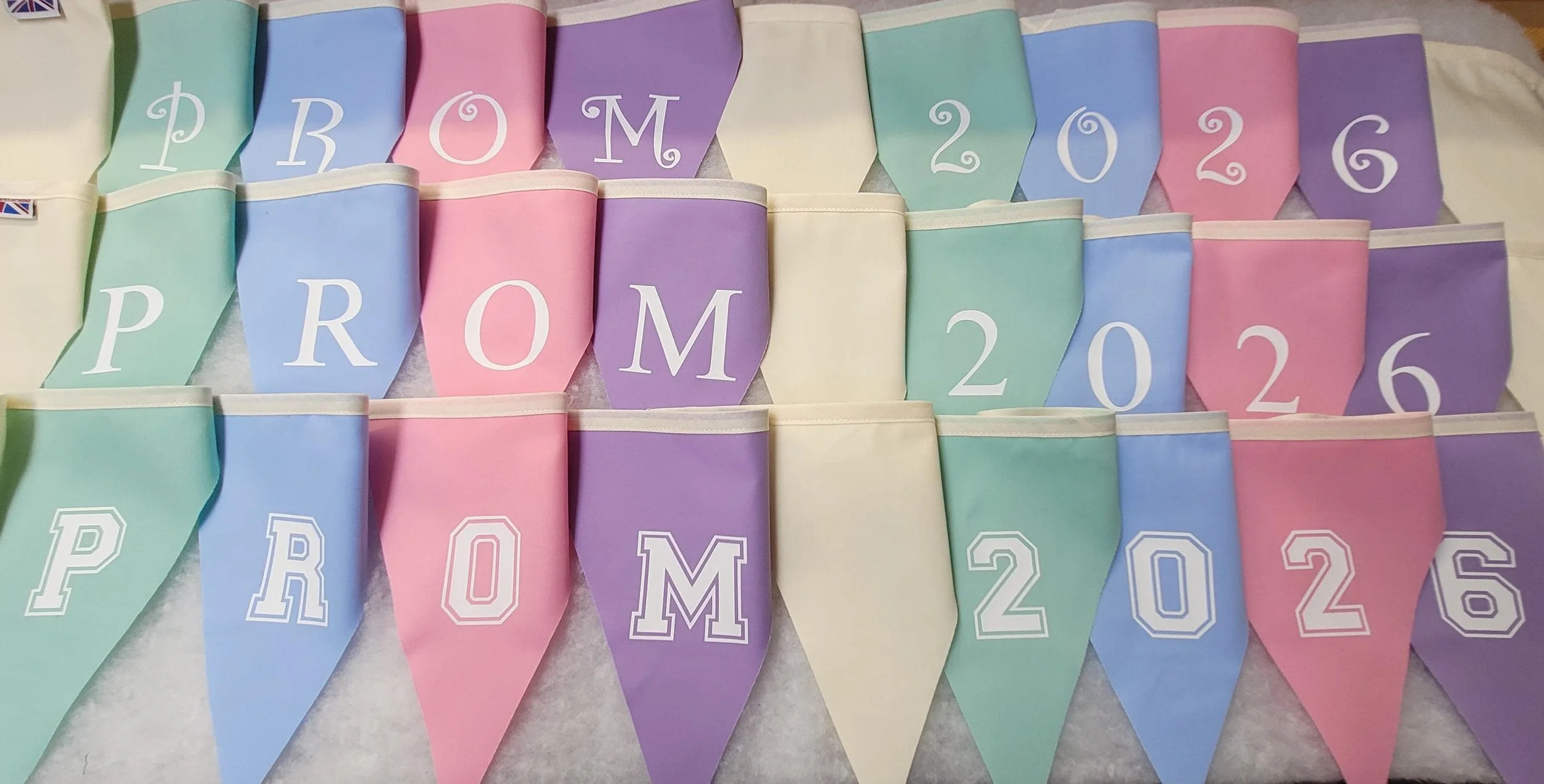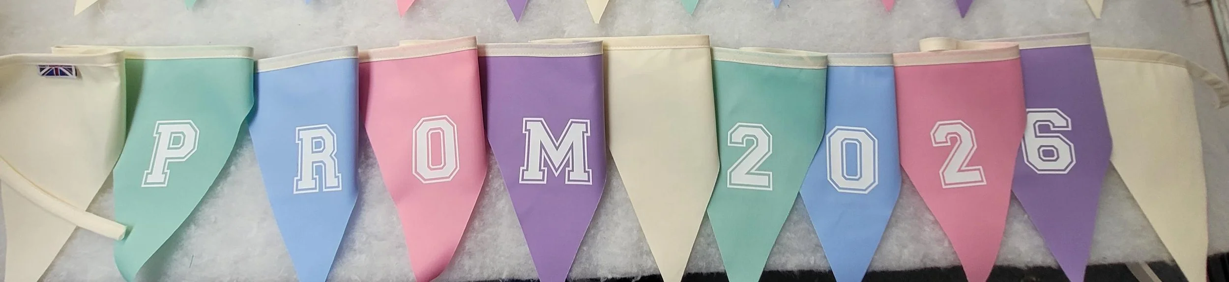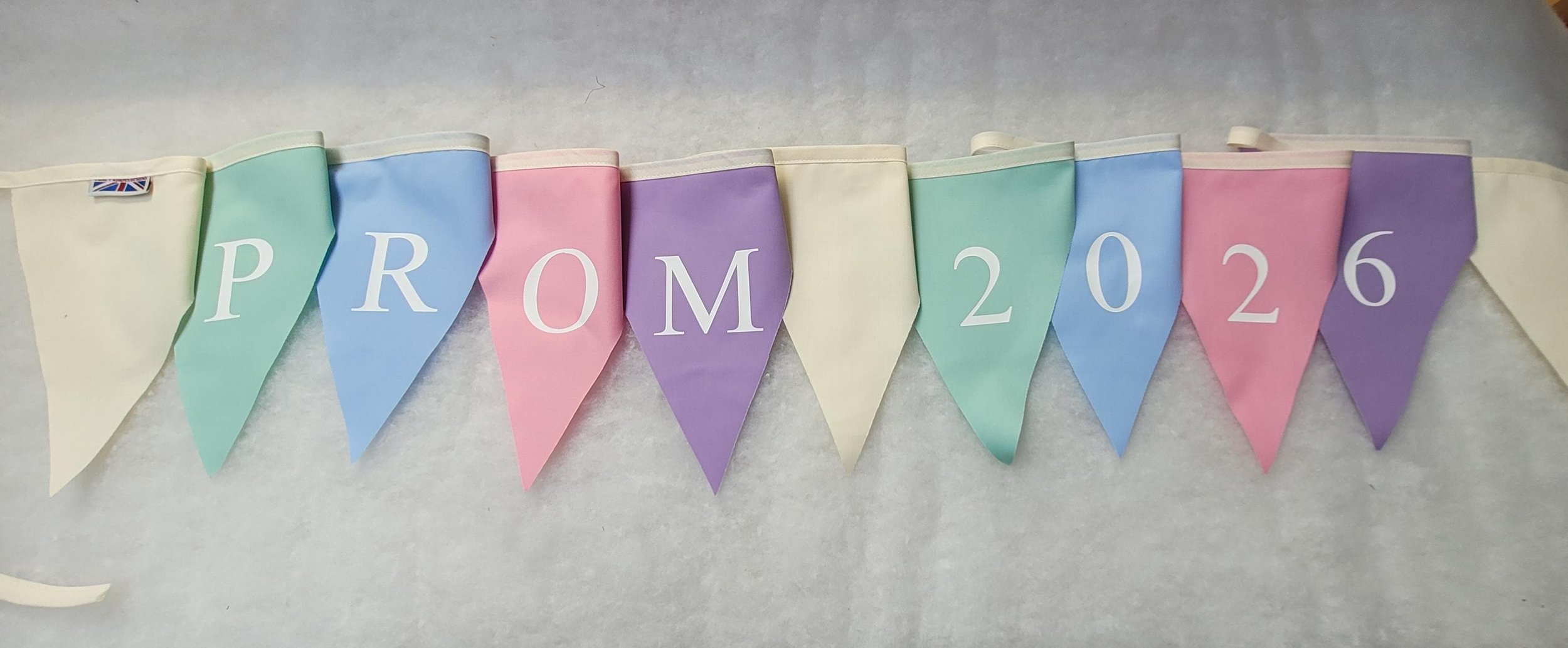 Shop › Printed prom 2026 fabric bunting - Option to personalise with name / school name Image 1 of 9 Image 2 of 9 Image 3 of 9 Image 4 of 9 Image 5 of 9 Image 6 of 9 Image 7 of 9 Image 8 of 9 Image 9 of 9 Printed prom 2026 fabric bunting - Option to personalise with name / school name from £12.99 Prom printed fabric buntingWe can print in White, black or silver letteringPrinted Prom 2026 - 11 flagsPersonalised (name) Prom 2026 so it would read for eg - Mollys Prom 2026 or a school nameFlag size approx - 20cm high and 22cm at top width of the flagPoly cotton single sided flags with cotton hangerAll made in England to fantastic quality Other flag colours available just message which colour flags you would like and we will see if we can matchWe also can make plain 10 mtr fabric bunting to complement the printed bunting design: Select design swirl times new roman block lettering: Select lettering (add name) prom 2026 prom 2026 Add To Cart Added! Prom printed fabric buntingWe can print in White, black or silver letteringPrinted Prom 2026 - 11 flagsPersonalised (name) Prom 2026 so it would read for eg - Mollys Prom 2026 or a school nameFlag size approx - 20cm high and 22cm at top width of the flagPoly cotton single sided flags with cotton hangerAll made in England to fantastic quality Other flag colours available just message which colour flags you would like and we will see if we can matchWe also can make plain 10 mtr fabric bunting to complement the printed bunting