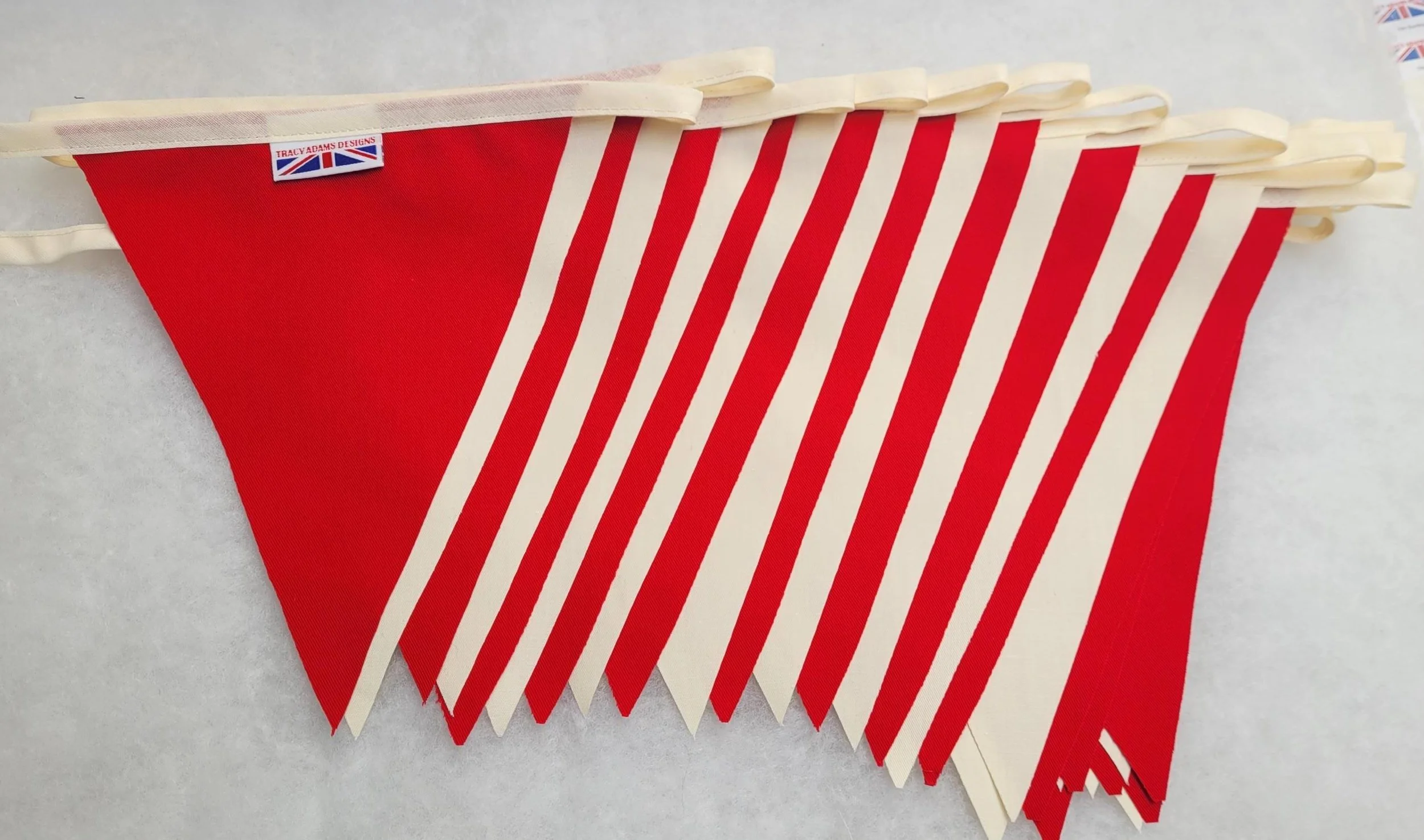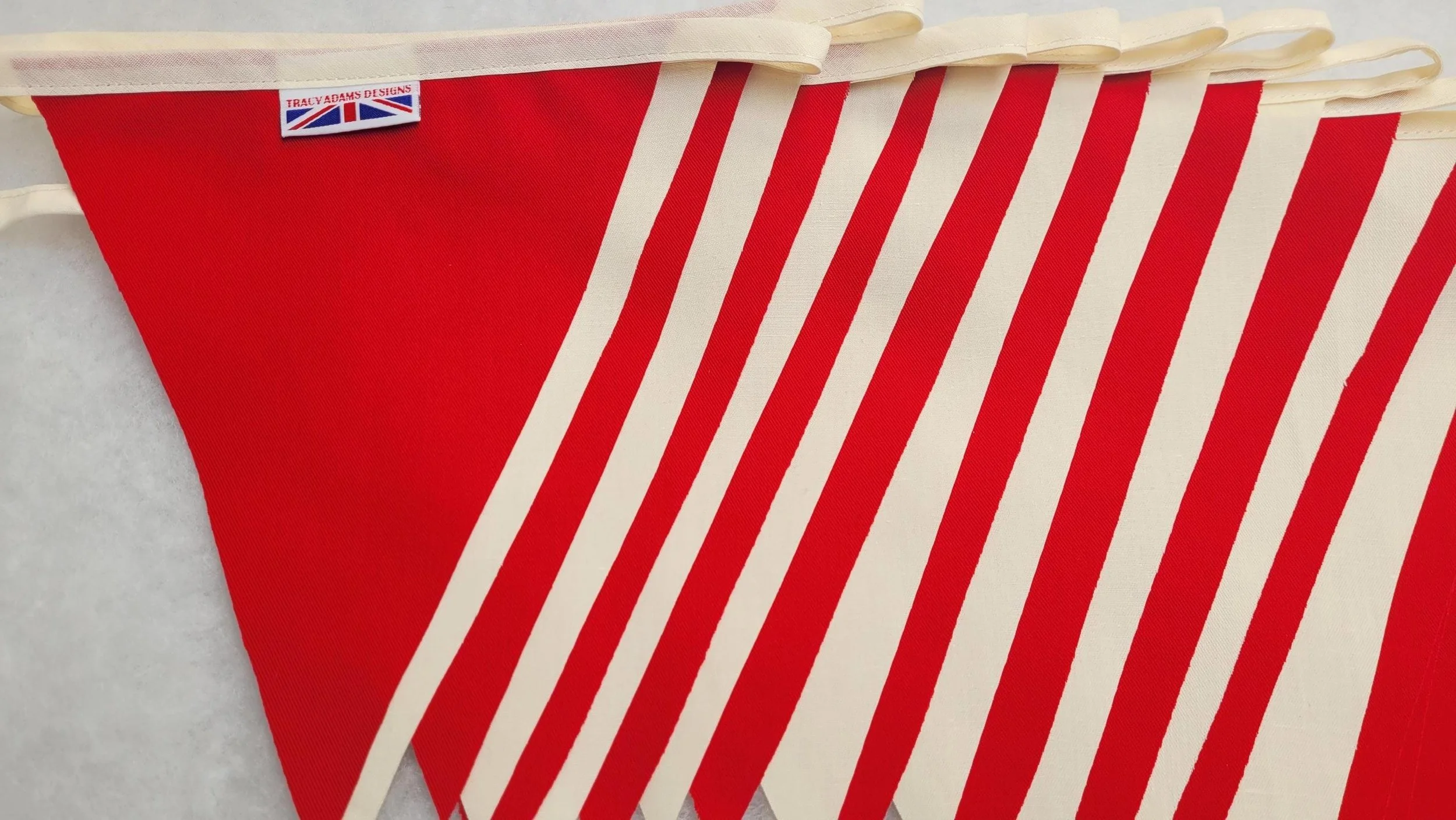 Shop › Red and Cream fabric bunting - 10 mtr. Made in England Image 1 of 2 Image 2 of 2 Red and Cream fabric bunting - 10 mtr. Made in England £11.99 Red and Cream bunting Red or Cream hanger across the topEach bunting is 10 mtrs 10 metre has 30 flags Poly cotton single sided flags with cotton hangeflags are the same colour on reverse of the flag as the frontFlags approx 20cm in length and 22cm width at the topAll made in England to fantastic qualityOther colours and lengths available please don't hesitate to message me binding across the top of flags: Red Cream Add To Cart Added! Red and Cream bunting Red or Cream hanger across the topEach bunting is 10 mtrs 10 metre has 30 flags Poly cotton single sided flags with cotton hangeflags are the same colour on reverse of the flag as the frontFlags approx 20cm in length and 22cm width at the topAll made in England to fantastic qualityOther colours and lengths available please don't hesitate to message me